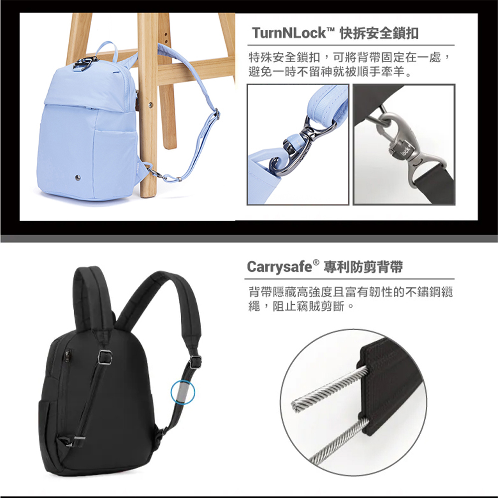 + 防割強化背帶(Carrysafe slashguard strap),內嵌輕量又具彈性的高強度不鏽鋼絲,防止盜賊利刃搶奪