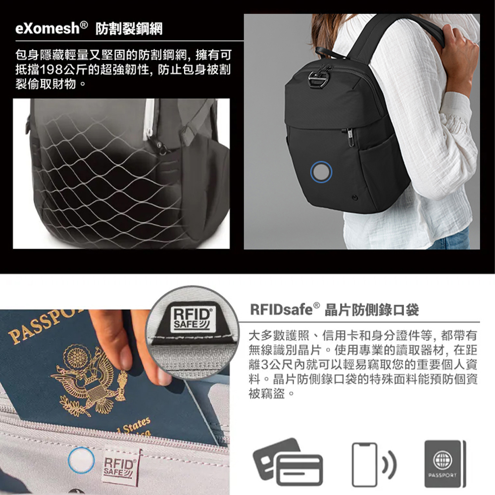 + 抗割裂保護網層(eXomesh Slashguards)袋內鋼網可抵禦小刀割損,財物更安全