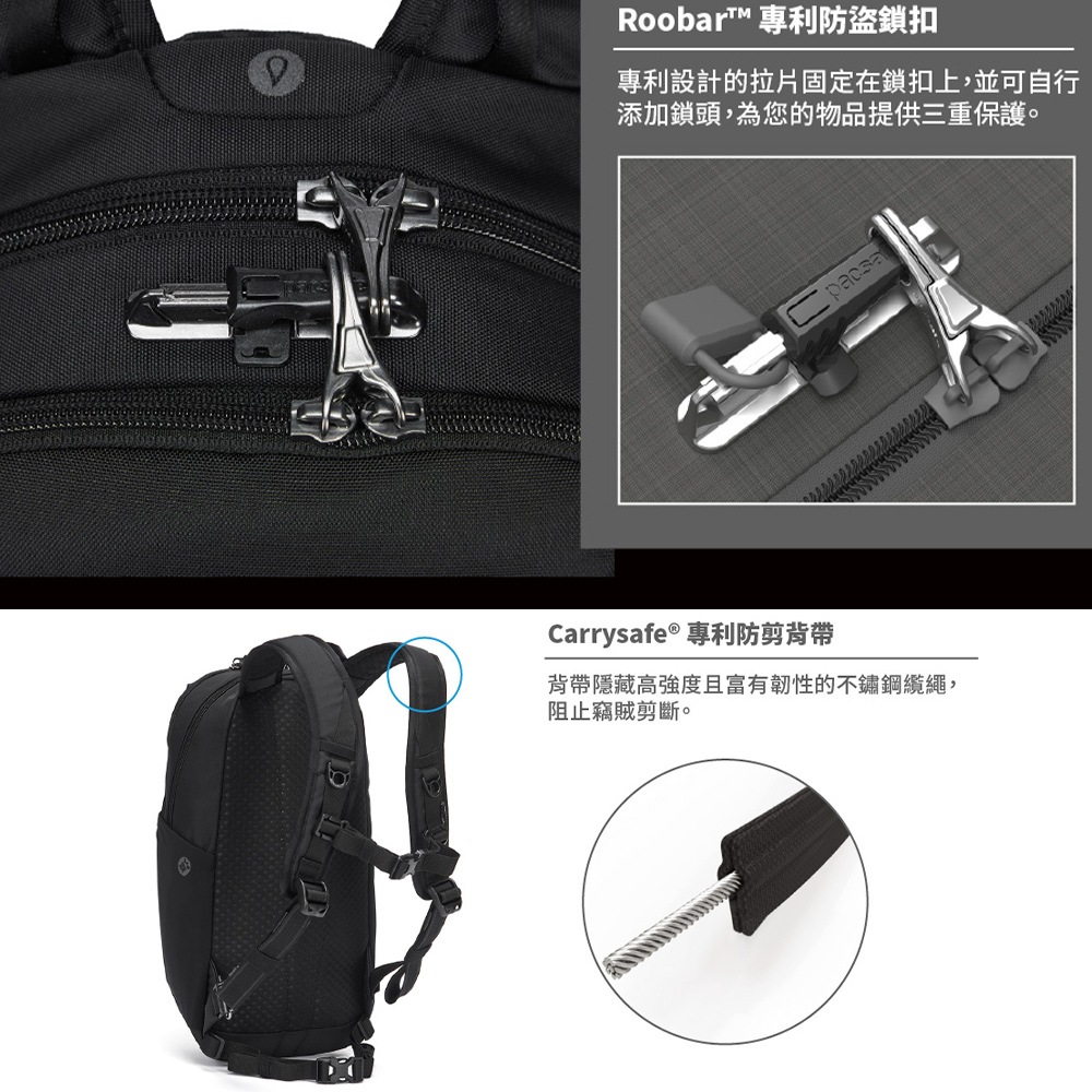 – Carrysafe®專利防剪背帶,背帶隱藏不鏽鋼纜繩